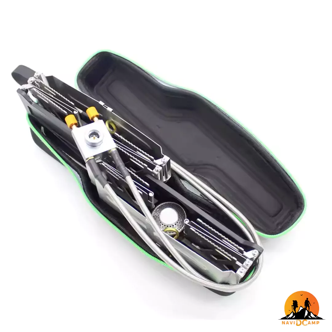 با وجود این قدرت دوگانه، مدل BRS-32 به طرز شگفتانگیزی قابل حمل است. جنس بدنه از آلومینیوم سبک ساخته شده که تعادلی عالی بین استحکام و وزن ایجاد کرده و وزن خالص کل دستگاه را در حدود 1 کیلوگرم (1030 گرم) نگه میدارد. پایهها و نگهدارنده از فولاد ضدزنگ ساخته شدهاند تا تحمل وزن بالای ظروف سنگین را داشته باشند. این سرشعله تاشو در ابعاد در حالت جمع (30 × 6.5 × 9.5 سانتیمتر) به یک بسته فشرده تبدیل شده و به راحتی در کیف حمل مخصوص خود و در کنار تجهیزات کمپینگ شما جای میگیرد.