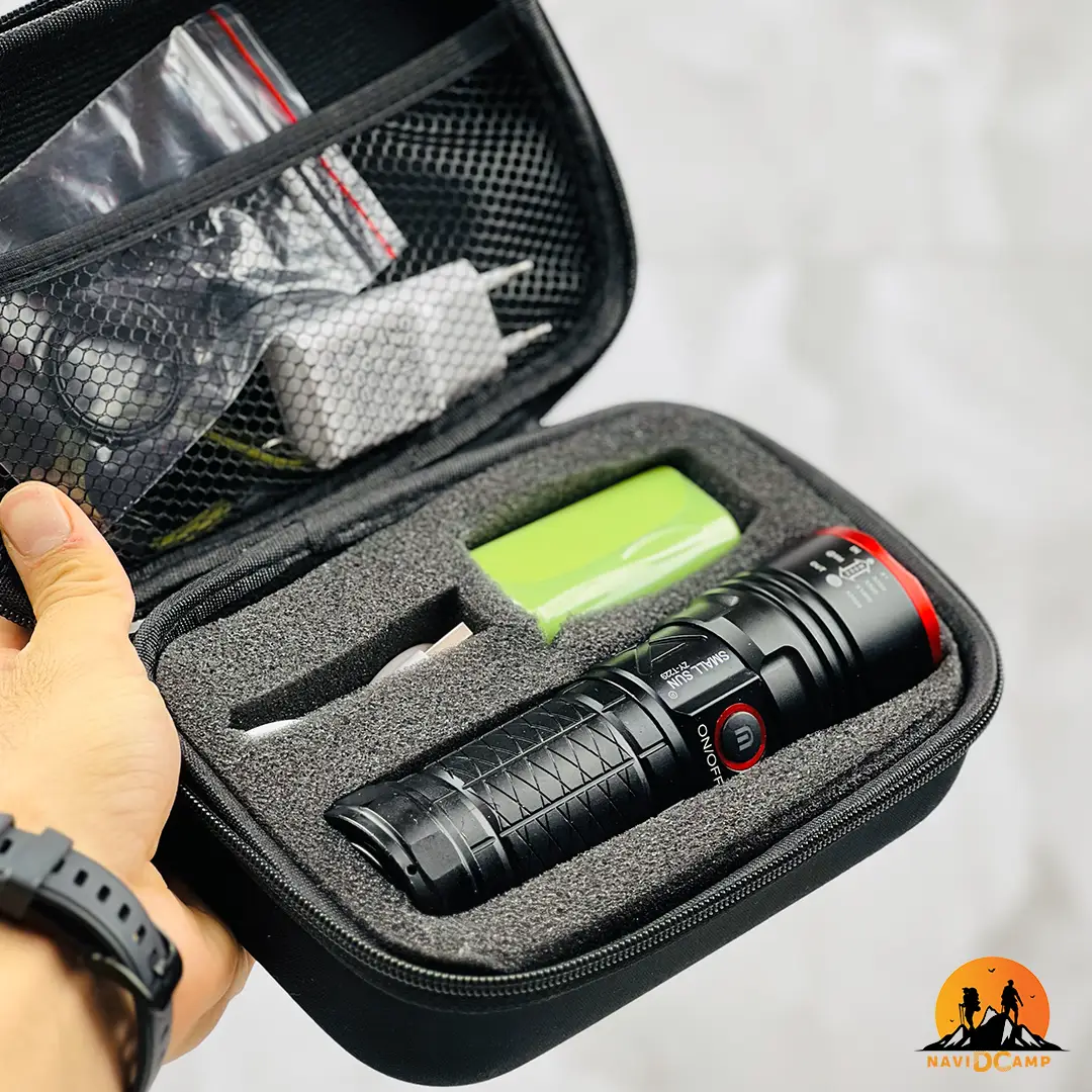 سازنده چراغ قوه smallsun یک پک شامل 3 عدد باتری 18650 با ظرفیت 7800 میلی آمپر را در اختیار شما عزیزان قرار داده است تا نوردهی عالی و بدون وقفه را تجربه کنید. برای دسترسی به باتری ها قسمت زیرین چراغ قوه را بچرخانید تا قاب آن باز شده و سپس باتری را بیرون بکشید. همچنین در داخل جعبه یک آداپتور فست شارژ و کابل قرار دارد که از نوع USB-C می باشد که بسیار با کیفیت است. وقتی چراغ قوه را برگردانید، درست در پشت جایی که کلید پاور تعبیه شده، سوکت شارژ را مشاهده میکنید که با اتصال شارژر تایپ سی از این طریق میتوانید T229 را شارژ کنید. برای شارژ اولیه این چراغ قوه حدود 8 تا 10ساعت زمان نیاز هست البته برای شارژهای بعدی حدود 5 تا 6 ساعت زمان نیاز دارد. توصیه ما به شما عزیزان برای افزایش طول عمر باتری این است که سعی کنید در حدود 15 درصد آن را به شارژ بزنید و در حدود 90 درصد از شارژ بکشید.