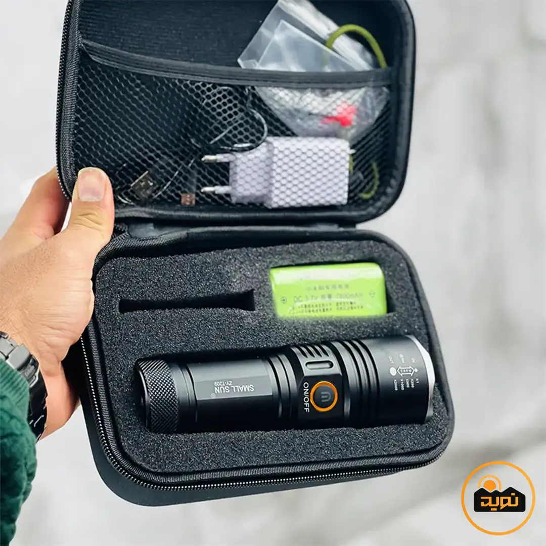 چراغ قوه اسمال سان مدل ZY-T209 با بدنه آلومینیومی، نور سفید یخی، برد 600 متر، ظرفیت باتری 7800 میلیآمپر، قابلیت زوم و ضد آب، مناسب شکار، نگهبانی و فعالیتهای فضای باز