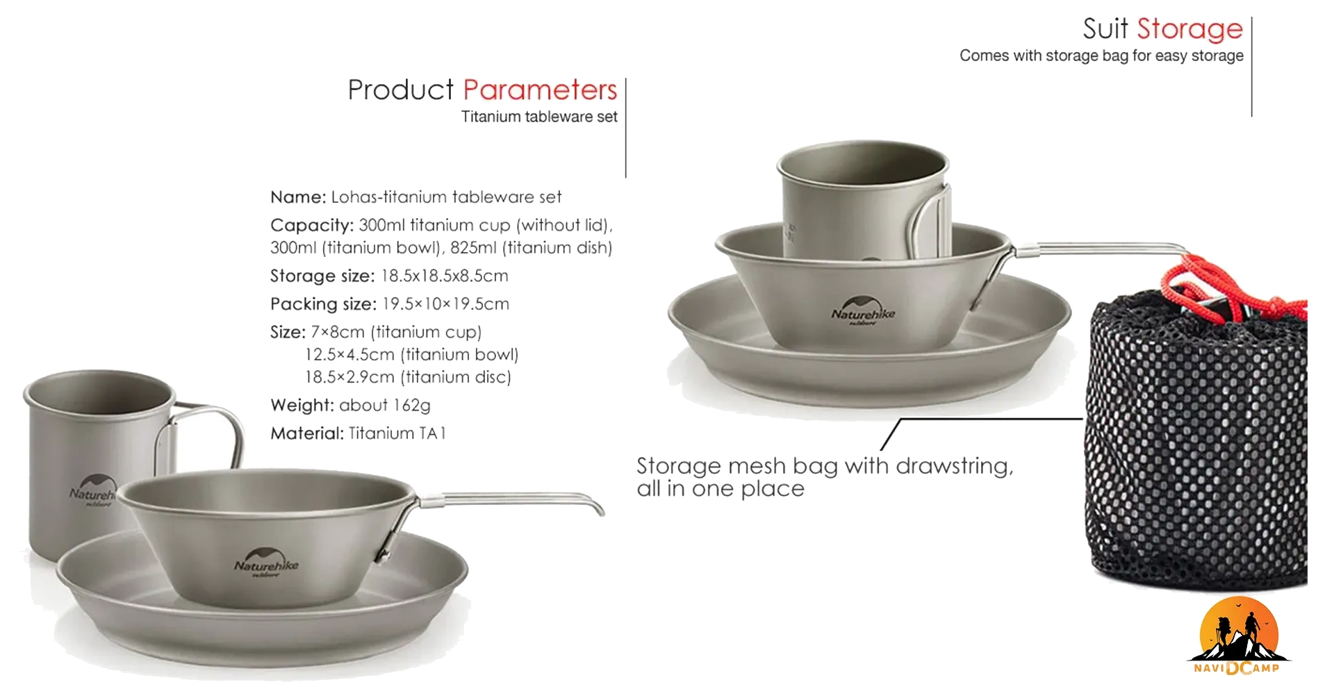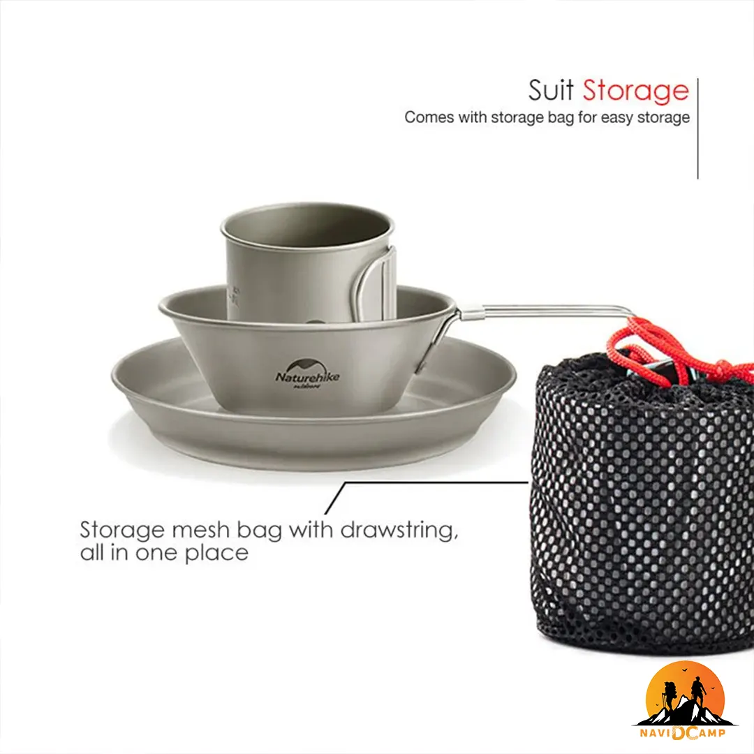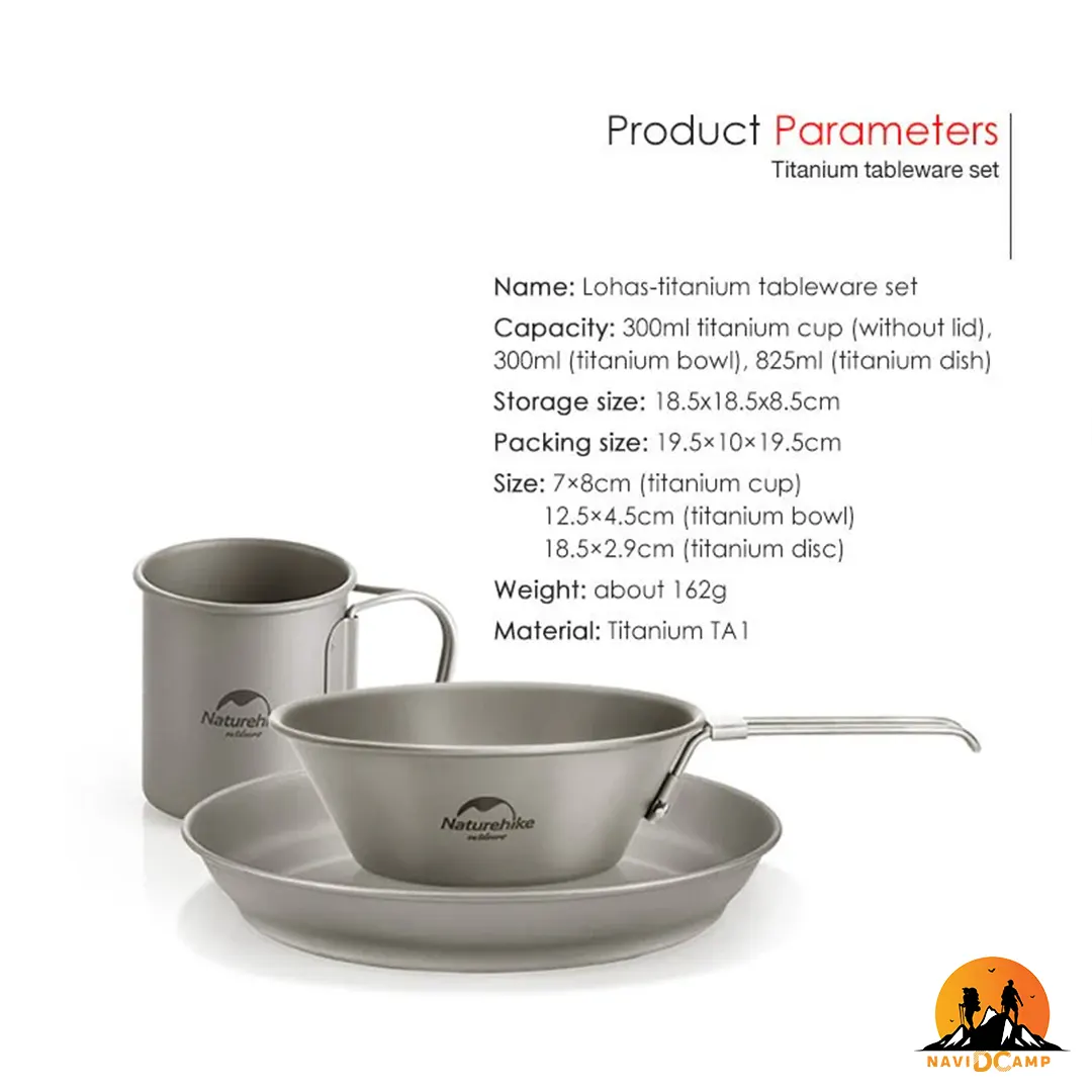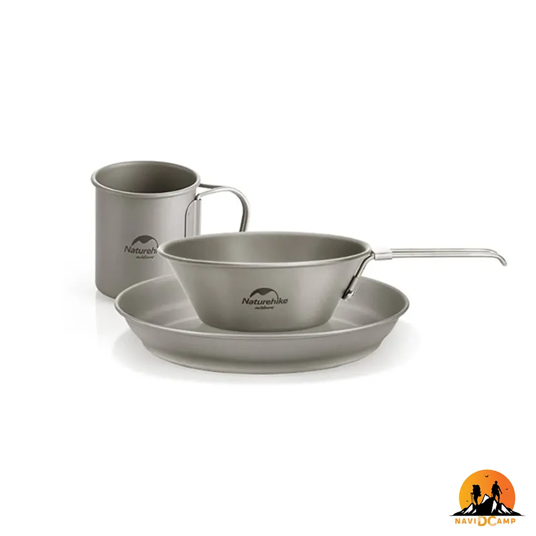 طراحی ست ظروف نیچرهایک ترکیبی از ظرافت مدرن در کنار مقاومت در برابر حمل و نقل خشن است که زیبایی و انعطاف پذیری فوق العاده ای به آن می بخشد. جنس تیتانیوم TA1 به کار رفته در ساخت این ست ظروف از با کیفیت ترین مواد ساخت ظروف است که مزیت های زیادی به نسبت دیگر جنس ها دارد. تیتانیوم قابلیت استفاده در هر دمایی را دارد و حتی می توان بر روی شعله مستقیم آتش از آن استفاده کرد. همچنین تیتانیوم قابلیت ضد زنگ و خوردگی دارد و در استفاده های طولانی مدت کیفیت اولیه خود را حفظ می کنند. مقاوم بودن در برابر هرگونه پرت شدن ظروف و ضربه و فشار، این ست ظروف را برای استفاده در هر شرایط محیط زیستی و کمپینگ های طولانی ایده آل می نماید. این ست کاربردی شامل بشقاب، کاسه و یک لیوان می باشد. بشقاب گنجایش 825 میلی لیتر و ابعادی معادل 2.8x18.5x18.5 سانتی متر را دارد. حجم کاسه 300 میلی لیتر و اندازه آن 20.8x4.5x12.6 سانتی متر است و لیوان حجمی معادل 300 میلی لیتر و شامل اندازه 7.7x7.7x6.6 سانتی متر می باشد. کل این ست در یک کیسه توری به ابعاد 18.5x18.5x8.5 قرار می گیرد و به راحتی درون کوله پشتی جای می گیرد. از نقاط قوت این ست ظروف وزن 162 گرمی آن است که مخصوصا برای کوهنوردانی که مسیری طولانی می پیمایند، فوق العاده است.