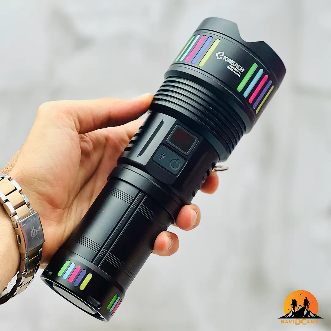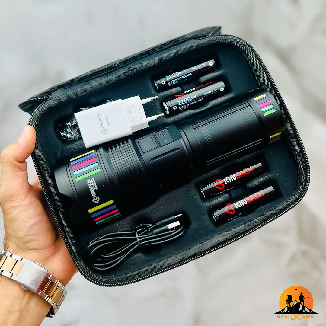 امروز قصد داریم یکی از حرفه ای ترین و قدرتمندترین چراغ قوه های کمپینگ را به شما معرفی کنیم که پیشنهاد شگفت انگیزی برای ماجراجویان حرفه ای و افراد سخت گیر و خاص پسند است. چراغ قوه کینساچ مدل KINSACH KS-G601Pro دقیقا همان ابزار حرفه ای است که با قدرت روشنایی خارق العاده و ساعت های طولانی نوردهی مداوم، تمام انتظارات افراد را برآورده می کند. علاوه بر روشنایی خیره کننده، طراحی حرفه ای و ساختار مستحکم این چراغ قوه باعث می شود که در نگاه اول مجذوب آن شوید. بدنهای از جنس آلیاژ آلومینیوم مقاوم که تضمین می کند در سخت ترین شرایط محیطی و در برابر انواع ضربه ها و سایش مستحکم باشد. مقاومت در برابر آب از مزیت های این چراغ قوه خوش ساخت است که با دارا بودن استاندارد IPX4، دیگر نگران استفاده از چراغ قوه در محیط های بارانی یا مرطوب نخواهید بود. طراحی ظاهری چراغ قوه کینساچ بسیار مدرن و شیک است و بدنه ای به رنگ مشکی با نوارهای تزئینی رنگی، ظاهر جذاب آن را تشکیل می دهد. این چراغ قوه مقاوم با وجود ساختار مستحکم، از وزن سبکی برخوردار است و بسیار ارگونومیک و خوش دست می باشد و در استفاده های طولانی مدت به هیچ عنوان دست را خسته نمی کند. چراغ قوه KS-G601Pro مجهز به یک عدد لامپ LED پرقدرت است که نوری سفید قدرتمند را با شدت روشنایی 5000 لومن واقعی ارائه می دهد. برد نوری بالای این ابزار حرفه ای، دیدی شفاف و وسیع را در شبهای مطلق فراهم میآورد. همچنین با فناوری بهکاررفته در آن، شدت نور را بهینهسازی کرده و با مصرف انرژی کم، حداکثر روشنایی را ارائه میدهد. اگر شما هم کنجکاو هستید تا اطلاعات بیشتری از این چراغ قوه پرطرفدار داشته باشید، تا انتهای معرفی همراه ما بمانید.