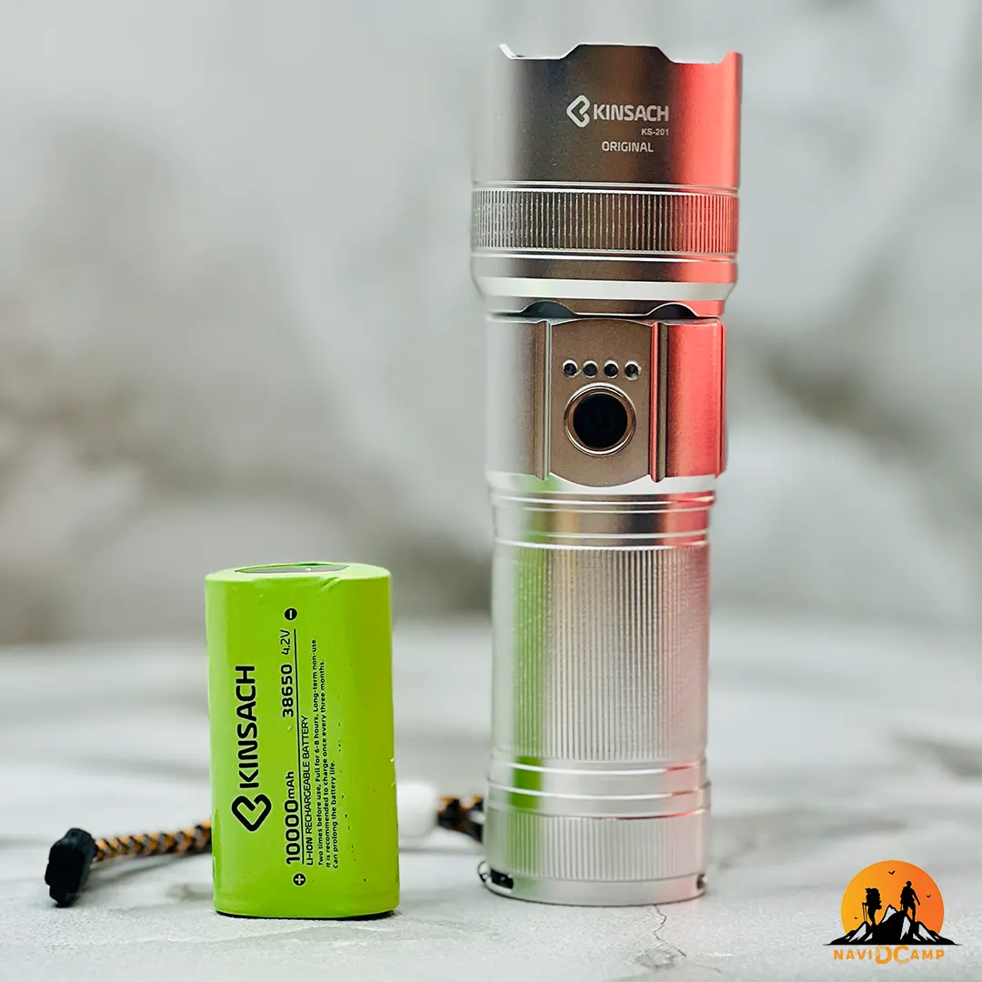 چراغ قوه های برند کینساچ با کیفیت ساخت و طراحی فوق العاده و بسیار قدرتمند روانه بازار میشوند و محصولات برند کینساچ از هر جهت نسبت به مدل های مشابه در رده بالایی قرار دارند. چراغ قوه کینساچ مدل KINSACH KS-201 نیز از این قاعده مستثنی نیست و با بدنه ای مستحکم و قابلیت های نوردهی متنوع توانسته نظر کوهنوردان حرفه ای و علاقه مندان به طبیعت گردی را به خود جلب کند. از لحاظ روشنایی باید خدمت شما عرض کنم با شدت روشنایی 3000 لومن، واضح است که تاریکی شب را کاملا روشن می نماید و دید وسیع و واضحی را از محیط پیرامون به افراد می دهد. این شدت نور خیره کننده قدرتمند در کنار برد نوری 400 متری ترکیبی شگفت انگیز را خلق می کند که اجازه نمی دهد هیچ چیزی از دید افراد پنهان بماند. یکی از امکانات برجسته چراغ قوه کینساچ، وجود دو حالت نوردهی شامل نور متمرکز جلو و نور گسترده مهتابی کناری است که نور متمرکز جلو برای روشن کردن محوطه فضاهای باز و نور مهتابی جانبی برای روشنایی محیط در محیط های بسته ای نظیر داخل چادر کمپینگ، ماشین یا فضای کاری کاربرد دارد. همچنین به لطف قابلیت تنظیم کانون نور یا سیستم زوم نور، زاویه نور تابشی از حالت نقطهای متمرکز تا حالت پخششونده گسترده قابل تنظیم است تا در هر شرایطی نوردهی ایده آلی داشته باشید.